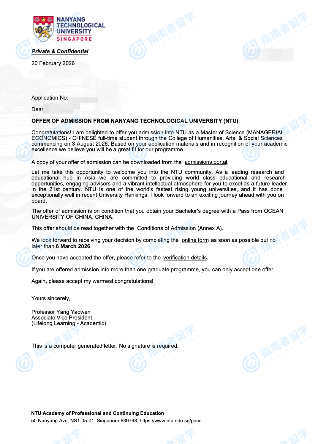南洋理工大學(xué)管理經(jīng)濟(jì)學(xué)理學(xué)碩士(中文授課)研究生offer一枚