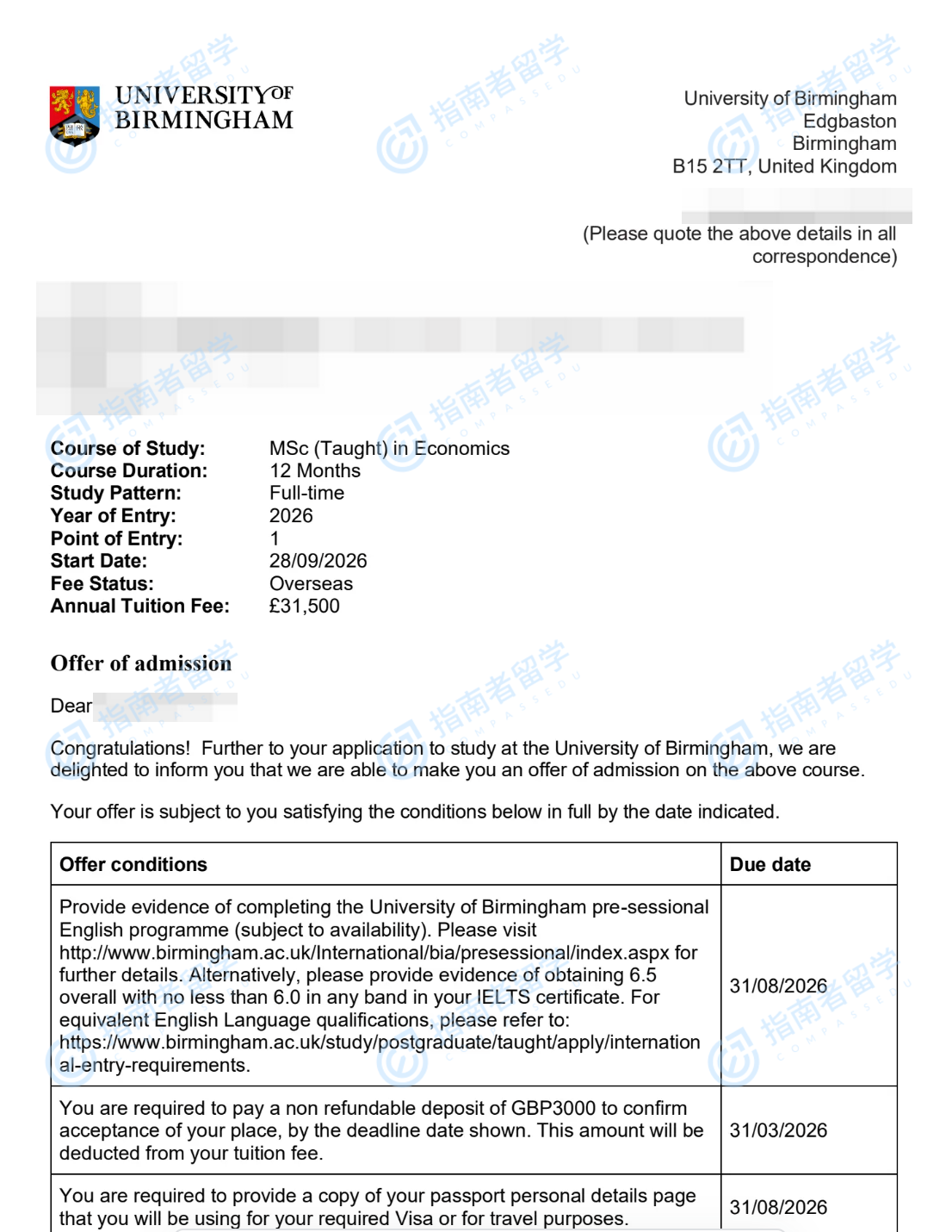 伯明翰大學(xué)金融經(jīng)濟(jì)學(xué)理學(xué)碩士研究生offer一枚