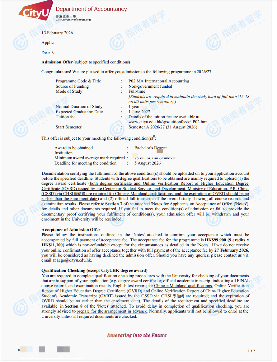 香港城市大學(xué)國(guó)際會(huì)計(jì)學(xué)文學(xué)碩士研究生offer一枚
