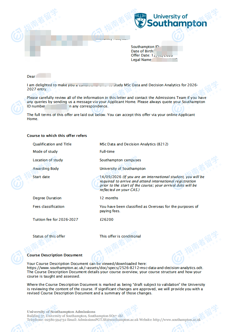 南安普頓大學數(shù)據(jù)與決策分析理學碩士研究生offer一枚