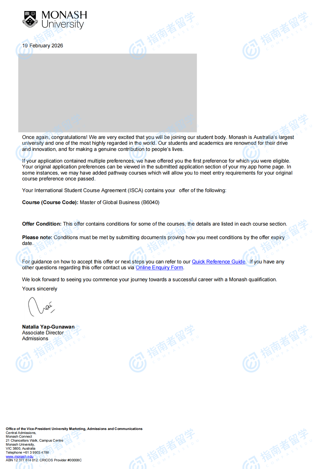 莫納什大學(xué)全球商務(wù)碩士(1.5年制)研究生offer一枚