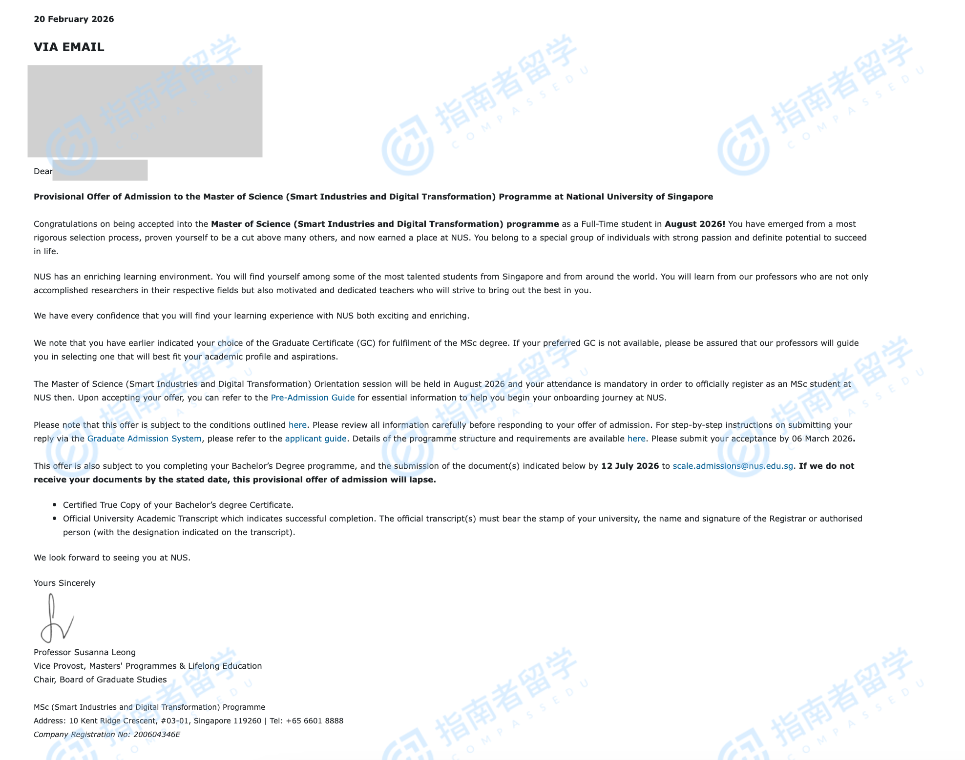 新加坡國立大學(xué)智能產(chǎn)業(yè)與數(shù)字化轉(zhuǎn)型理學(xué)碩士研究生offer一枚