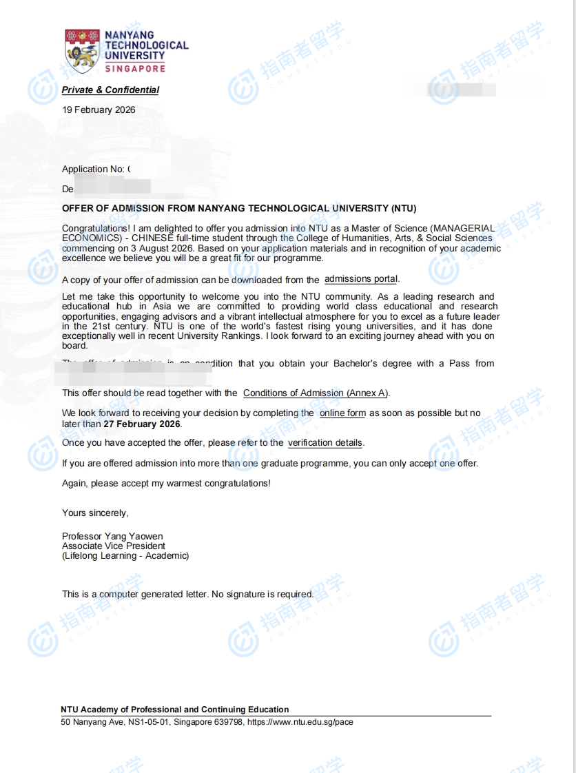 南洋理工大學(xué)管理經(jīng)濟(jì)學(xué)理學(xué)碩士(中文授課)研究生offer一枚