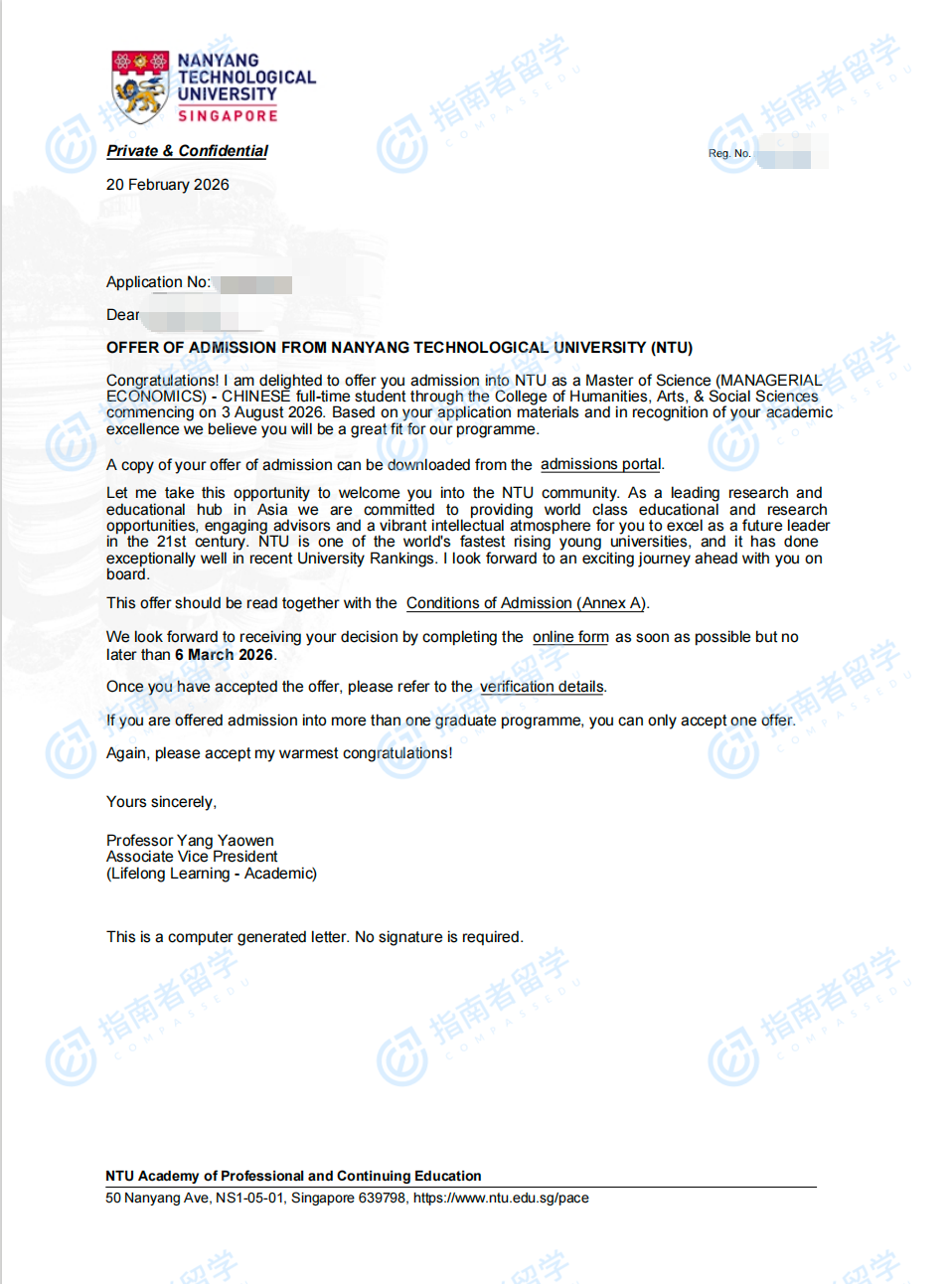 南洋理工大學(xué)管理經(jīng)濟(jì)學(xué)理學(xué)碩士(中文授課)研究生offer一枚