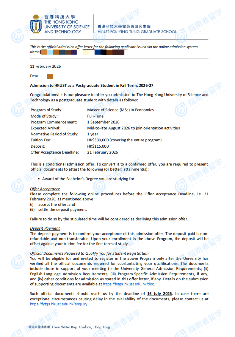 香港科技大學經濟學理學碩士研究生offer一枚
