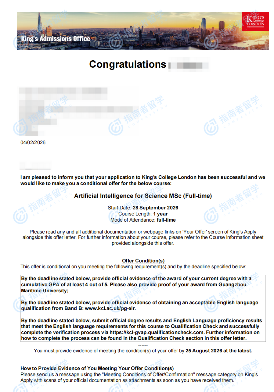 倫敦大學國王學院科學人工智能理學碩士研究生offer一枚