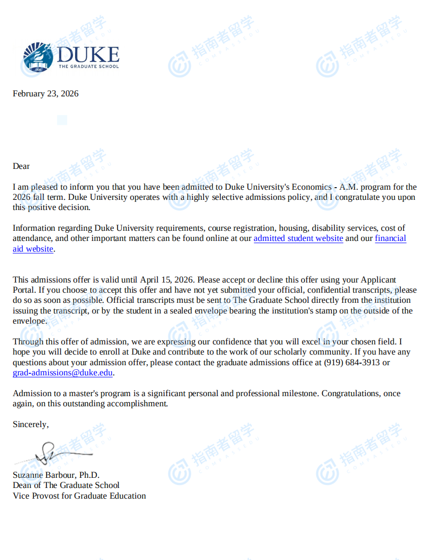 杜克大學經濟學碩士研究生offer一枚