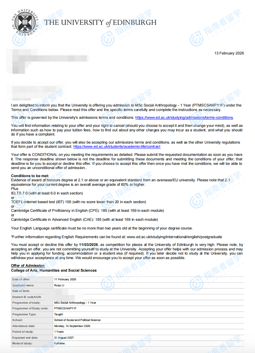 愛丁堡大學(xué)社會研究理學(xué)碩士研究生offer一枚