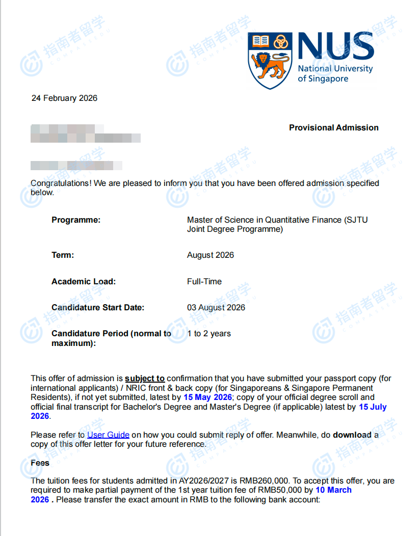 新加坡國立大學(xué)定量金融理學(xué)碩士(新加坡國立大學(xué)-上海交通大學(xué)聯(lián)合開設(shè))研究生offer一枚