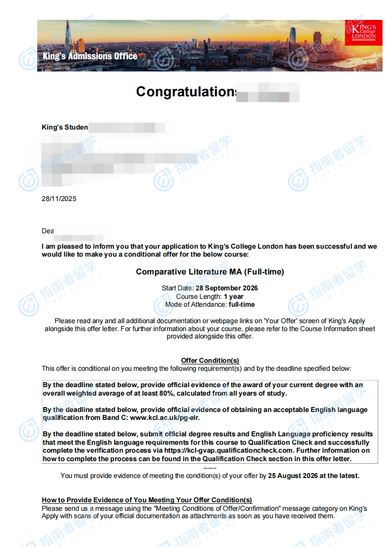 倫敦大學(xué)國王學(xué)院比較文學(xué)文學(xué)碩士研究生offer一枚