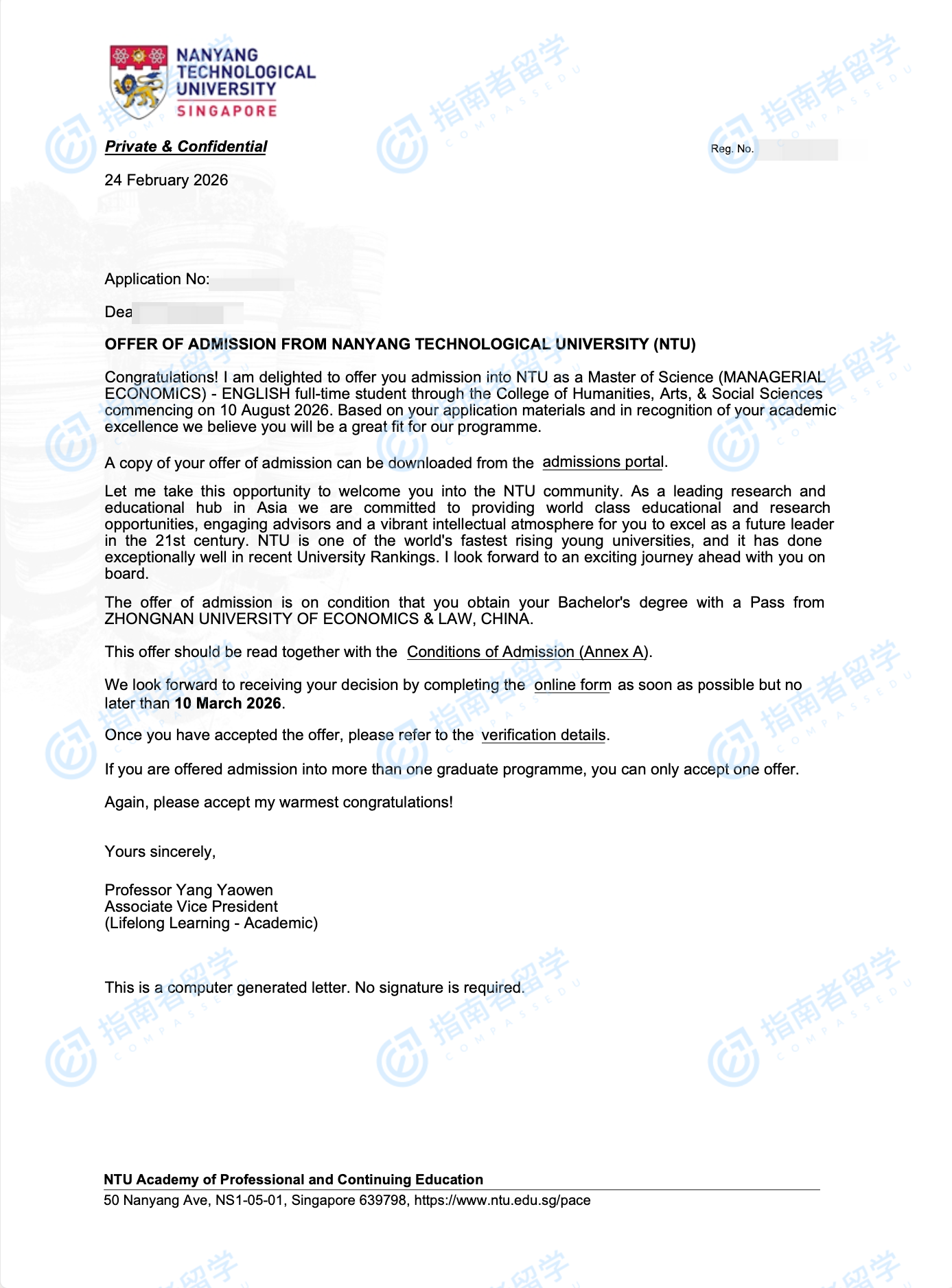 南洋理工大學(xué)管理經(jīng)濟學(xué)理學(xué)碩士(英文授課)研究生offer一枚