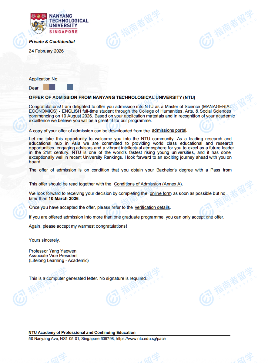 南洋理工大學(xué)管理經(jīng)濟(jì)學(xué)理學(xué)碩士(英文授課)研究生offer一枚