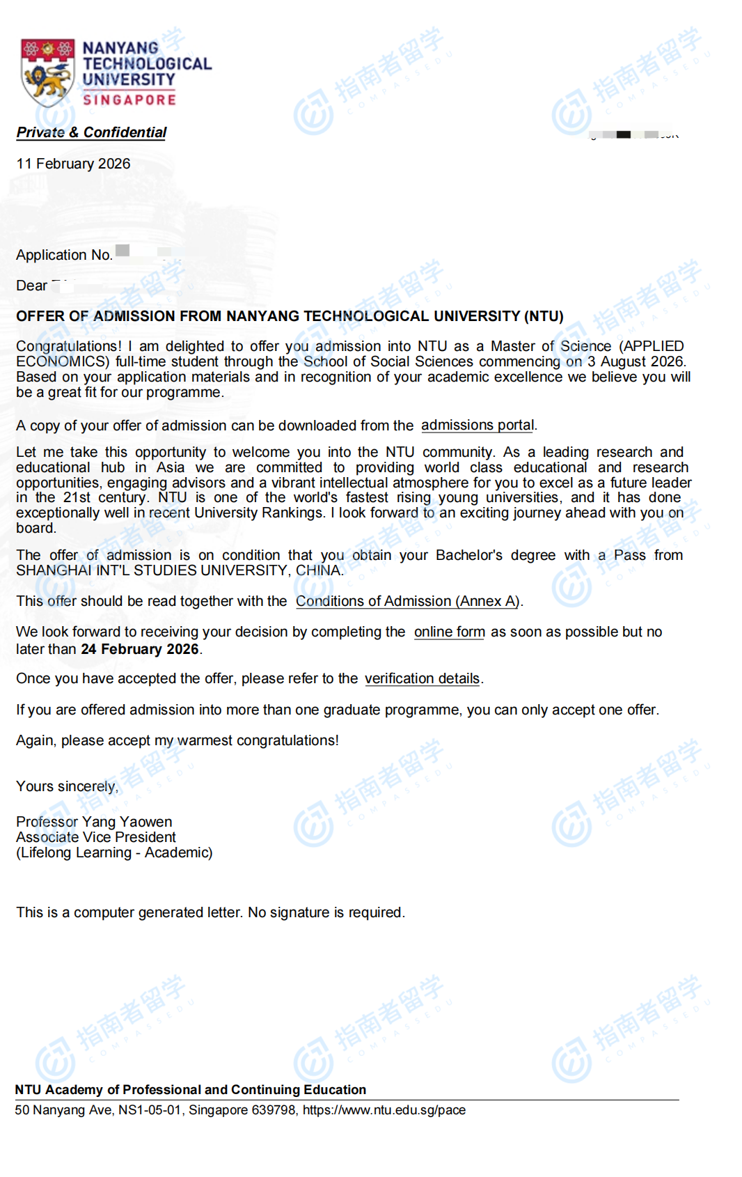 南洋理工大學管理經(jīng)濟學理學碩士(英文授課)研究生offer一枚