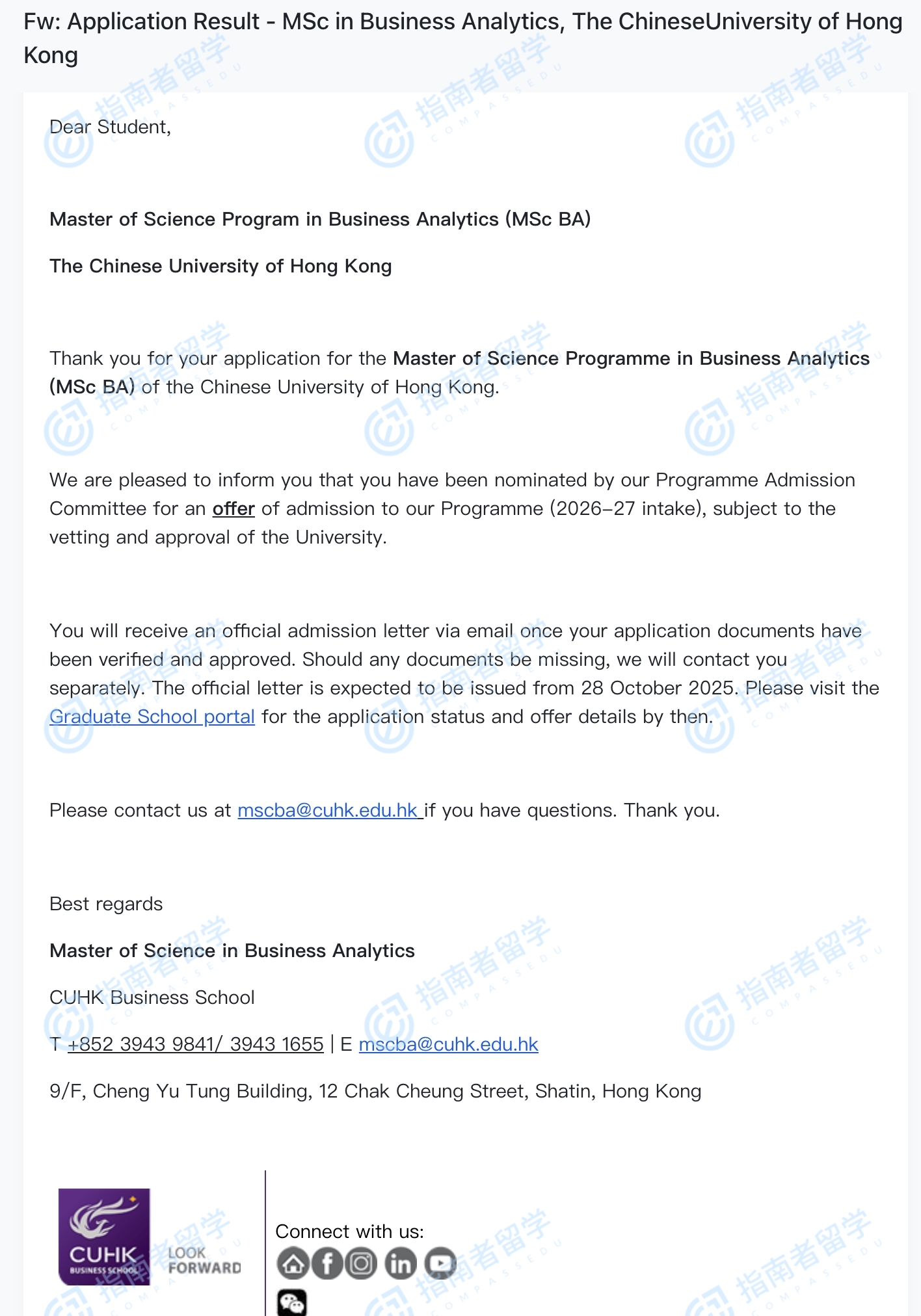 香港中文大學(xué)商業(yè)分析理學(xué)碩士研究生offer一枚