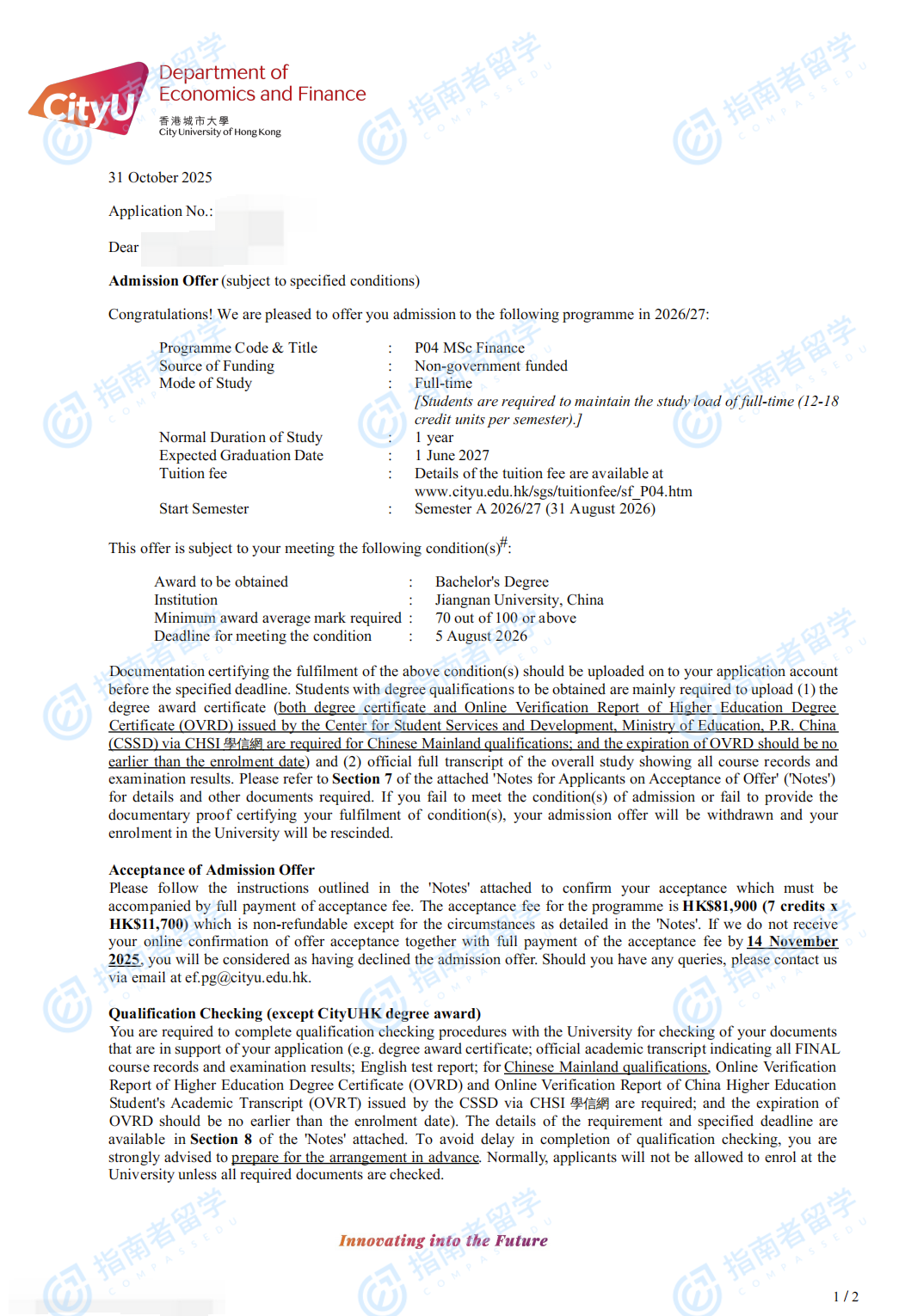 香港城市大學(xué)金融學(xué)理學(xué)碩士研究生offer一枚