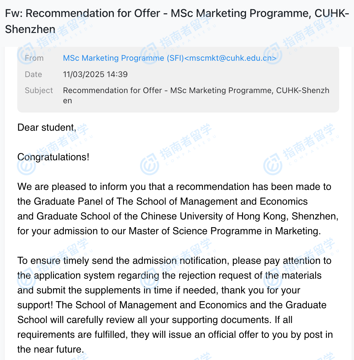 香港中文大學(xué)市場(chǎng)學(xué)理學(xué)碩士(CUHK-Shenzhen)研究生offer一枚