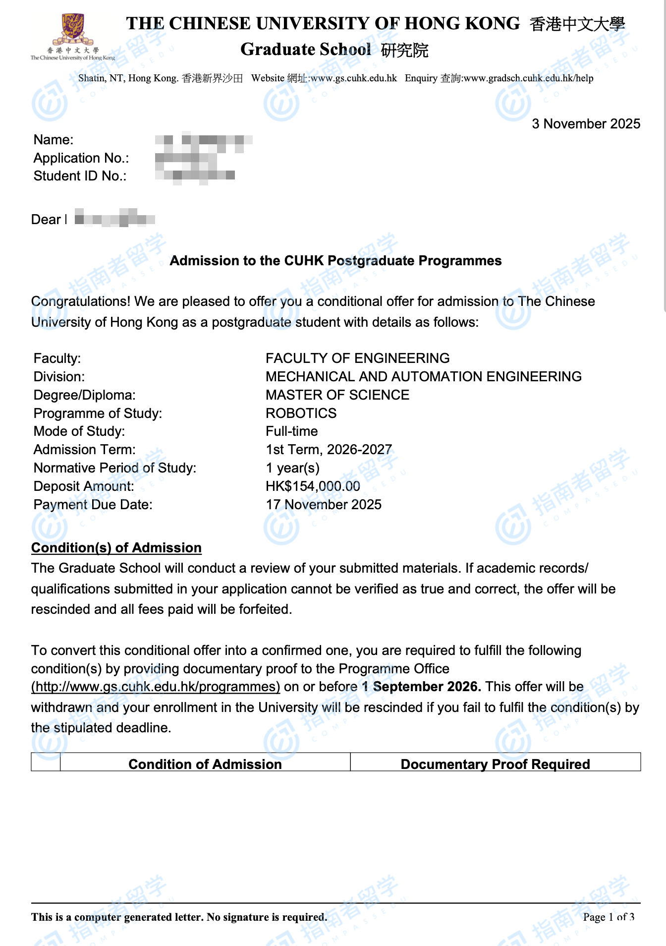 香港中文大學(xué)機(jī)器人學(xué)理學(xué)碩士研究生offer一枚