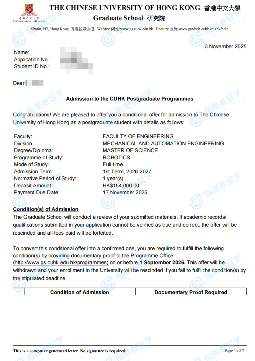香港中文大學(xué)機(jī)器人學(xué)理學(xué)碩士研究生offer一枚