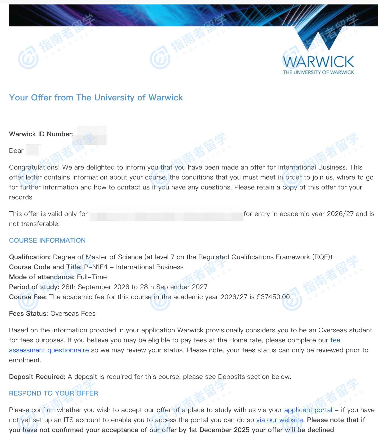 華威大學(xué)國(guó)際商務(wù)理學(xué)碩士研究生offer一枚