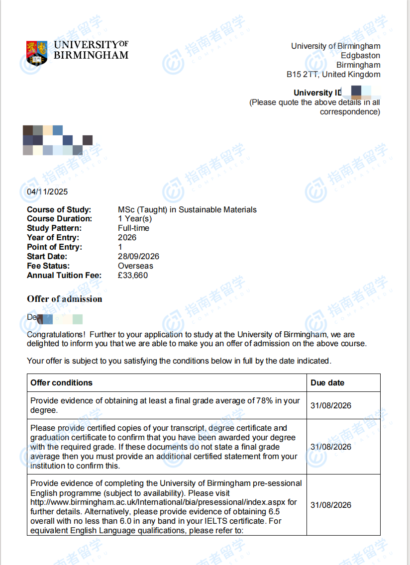 伯明翰大學材料科學與工程學理學碩士研究生offer一枚