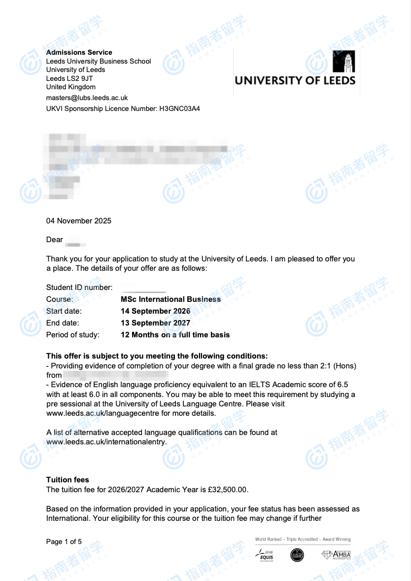 利茲大學(xué)國際商務(wù)理學(xué)碩士研究生offer一枚