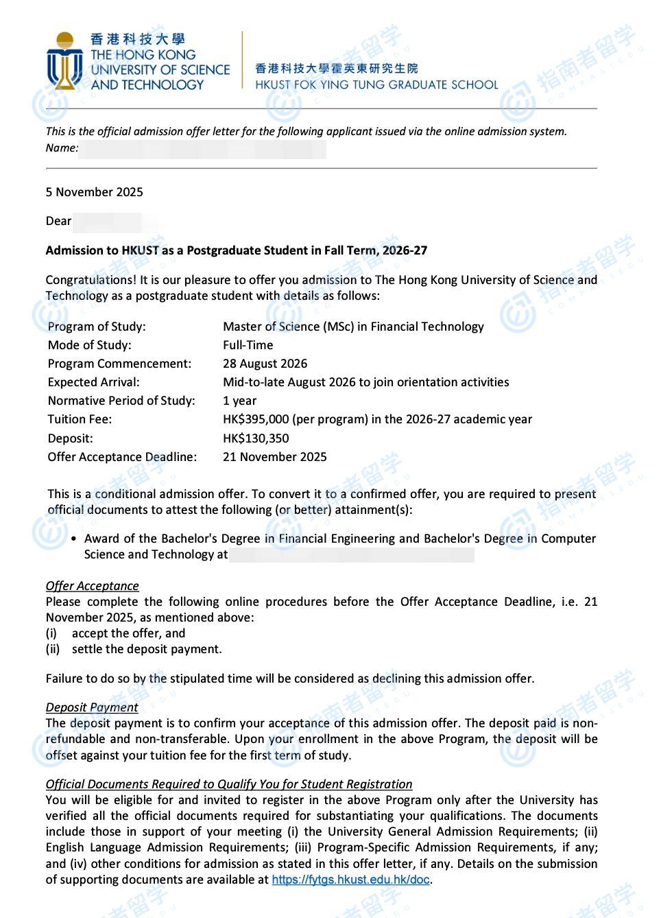 香港科技大學金融科技理學碩士研究生offer一枚