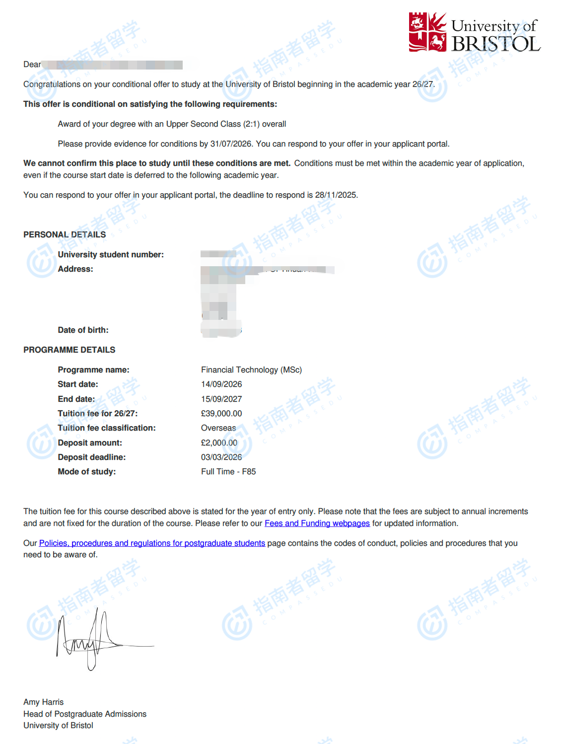 布里斯托大學(xué)金融科技理學(xué)碩士研究生offer一枚