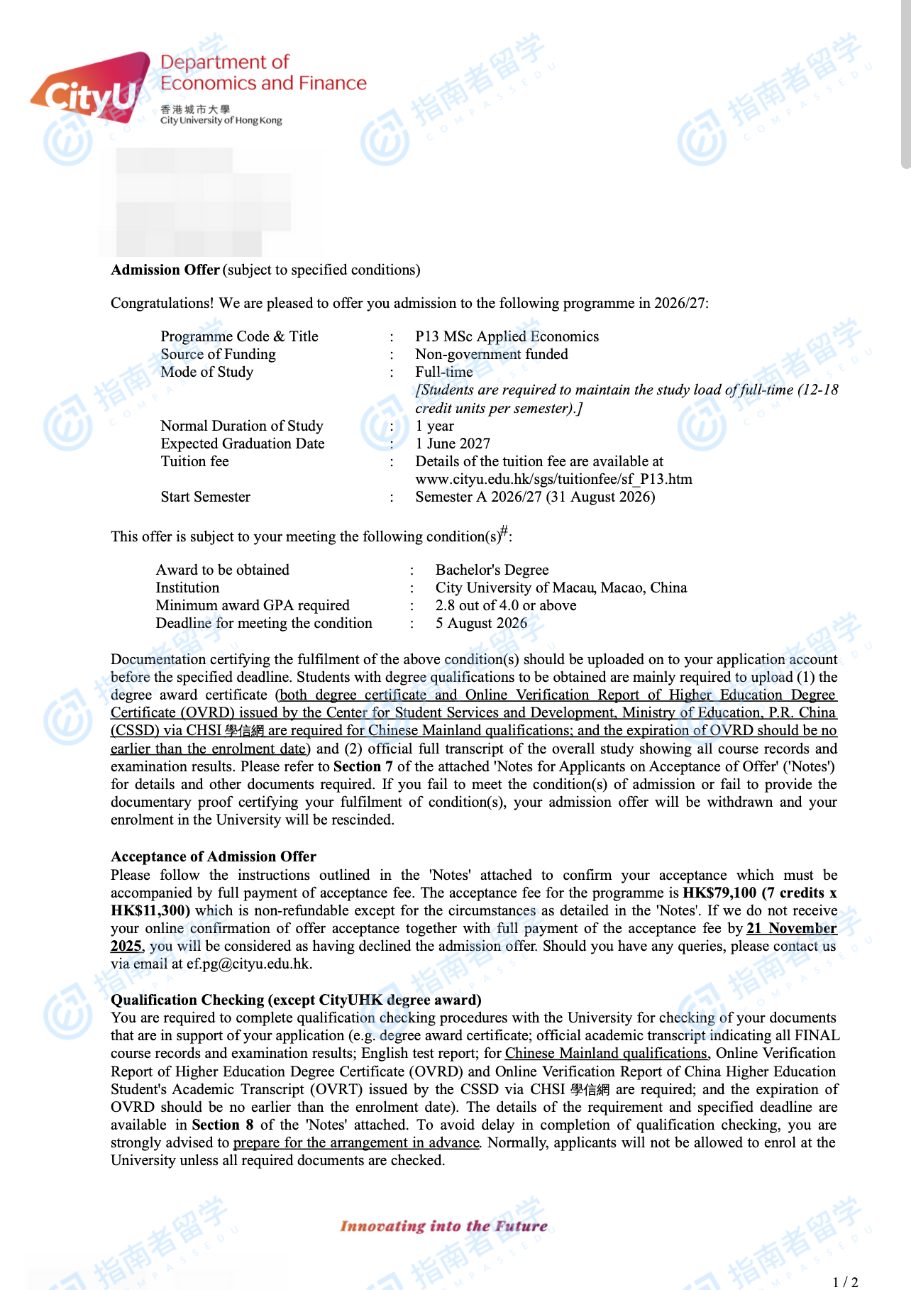 香港城市大學(xué)應(yīng)用經(jīng)濟(jì)學(xué)理學(xué)碩士研究生offer一枚