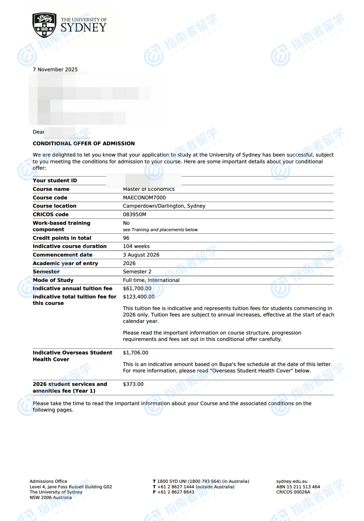 悉尼大學經(jīng)濟學碩士研究生offer一枚