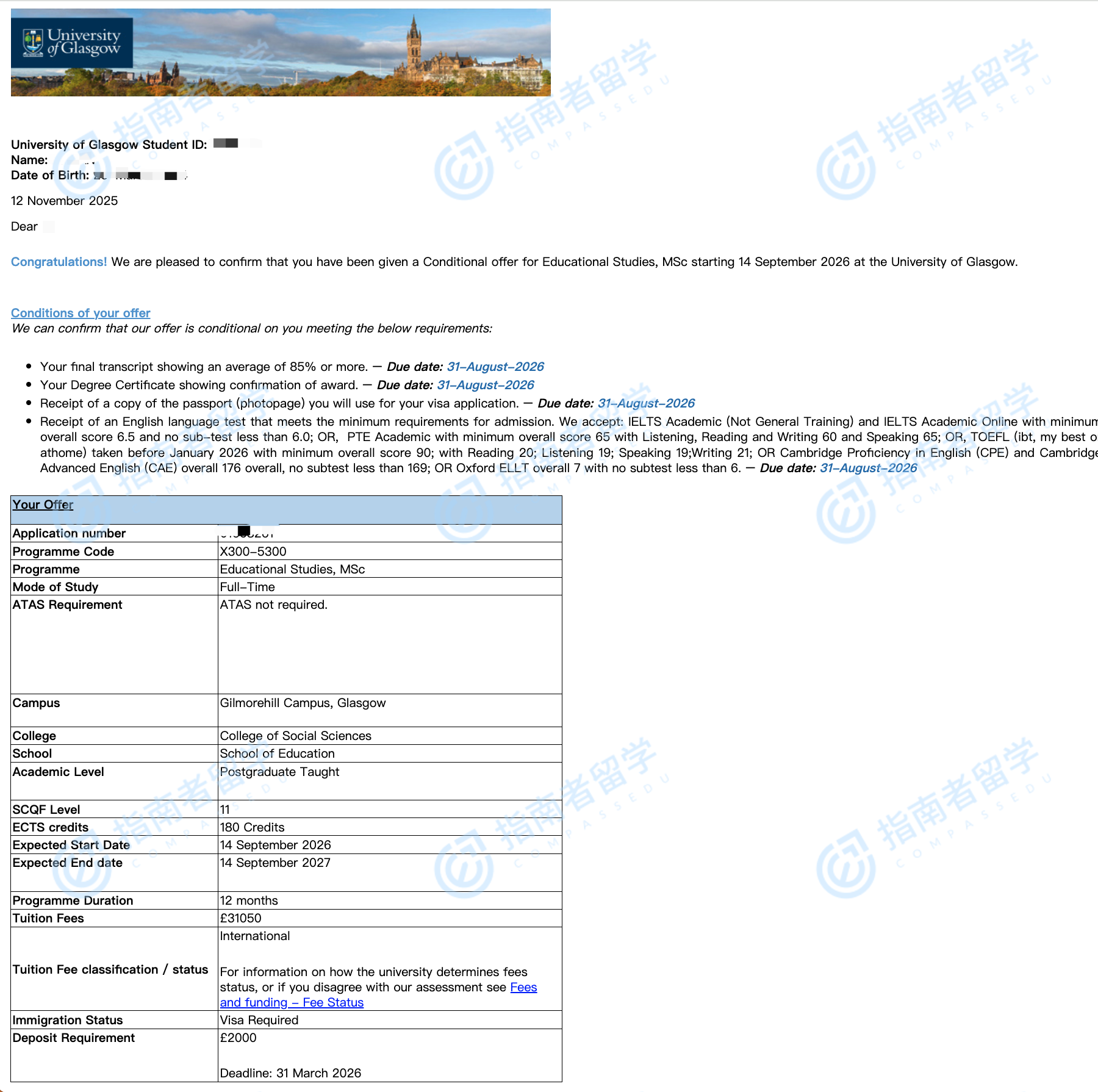 格拉斯哥大學(xué)教育學(xué)研究理學(xué)碩士研究生offer一枚