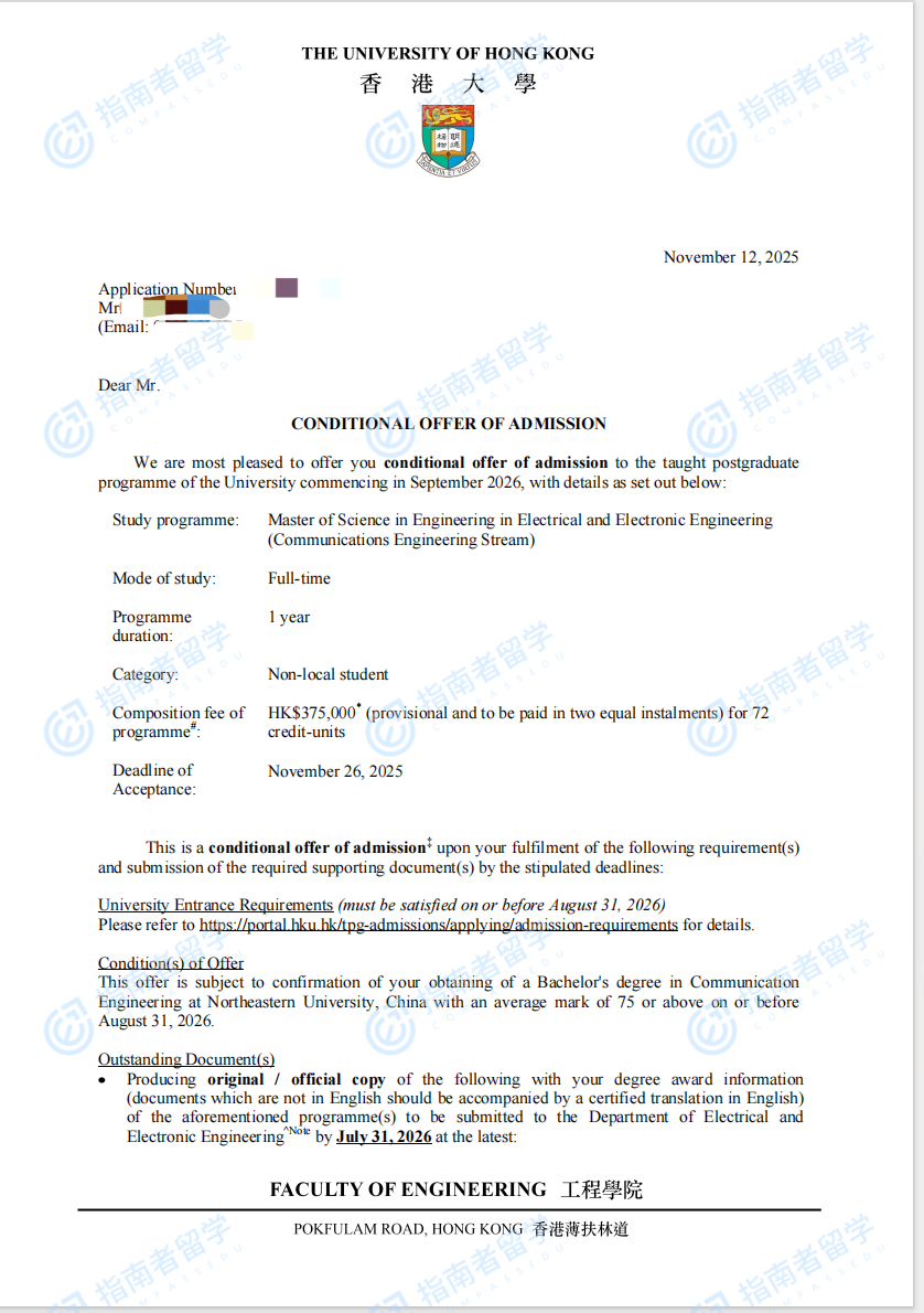 香港大學(xué)電氣與電子工程(工程)理學(xué)碩士 - 通信工程方向研究生offer一枚