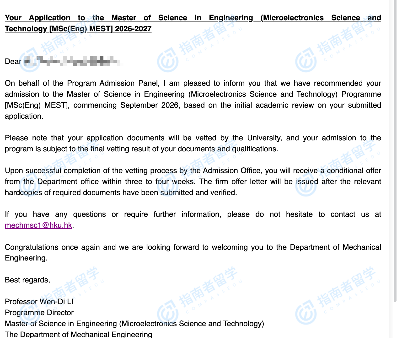 香港大學微電子科學與技術(工程)理學碩士研究生offer一枚