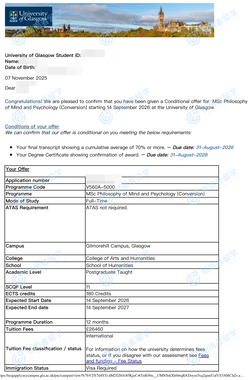 格拉斯哥大學(xué)心靈哲學(xué)與心理學(xué)理學(xué)碩士(可跨申)研究生offer一枚