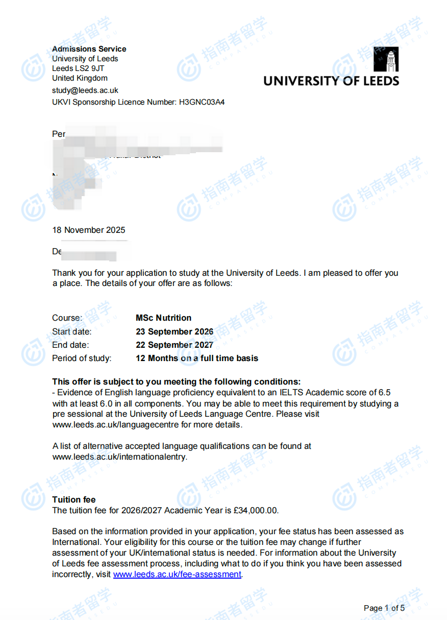利茲大學(xué)營養(yǎng)學(xué)理學(xué)碩士研究生offer一枚