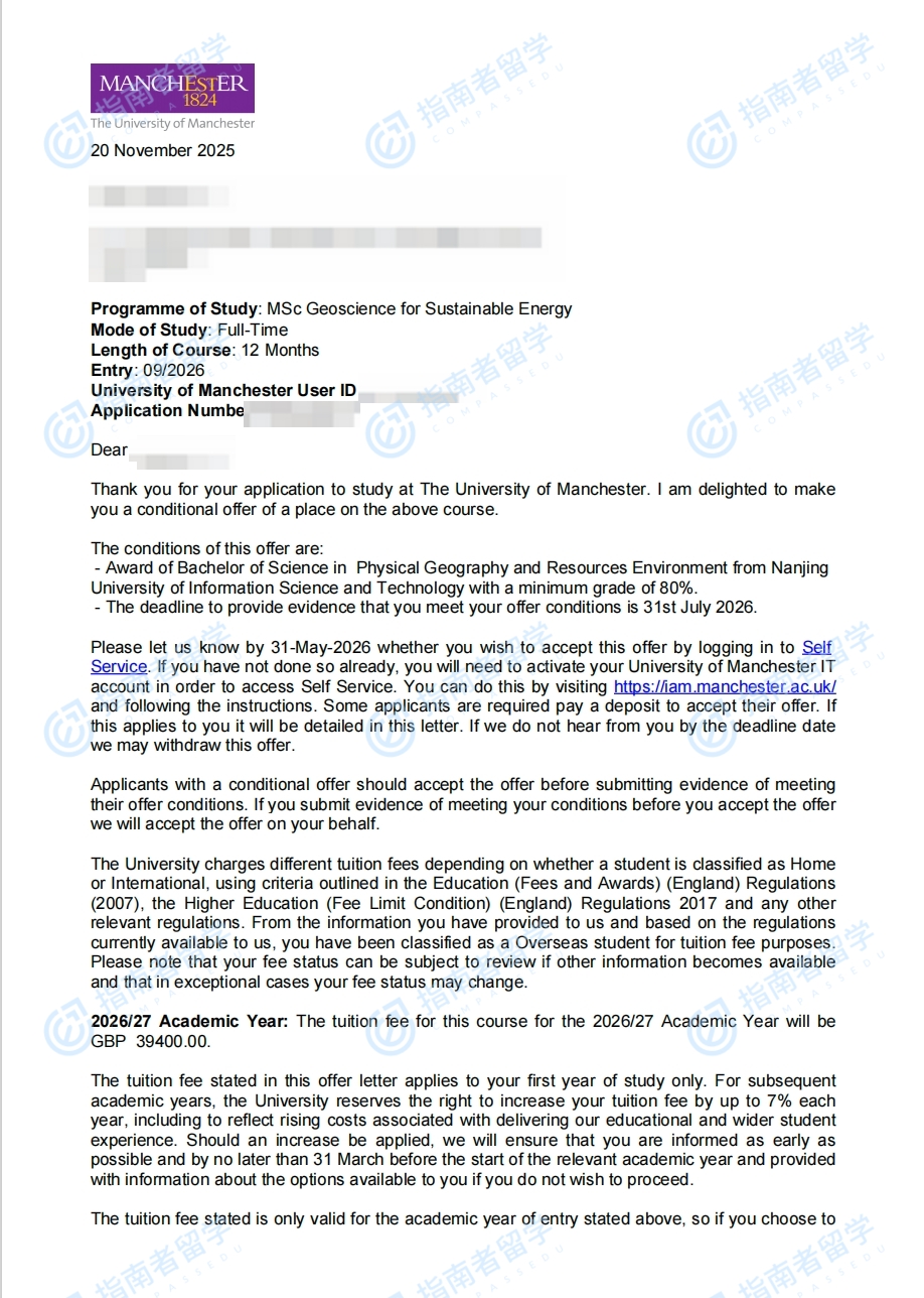 曼徹斯特大學(xué)可持續(xù)能源地球科學(xué)理學(xué)碩士研究生offer一枚