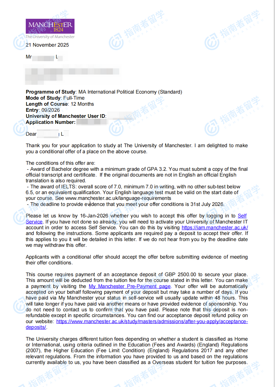 曼徹斯特大學(xué)國際政治經(jīng)濟學(xué)文學(xué)碩士(標(biāo)準(zhǔn))研究生offer一枚