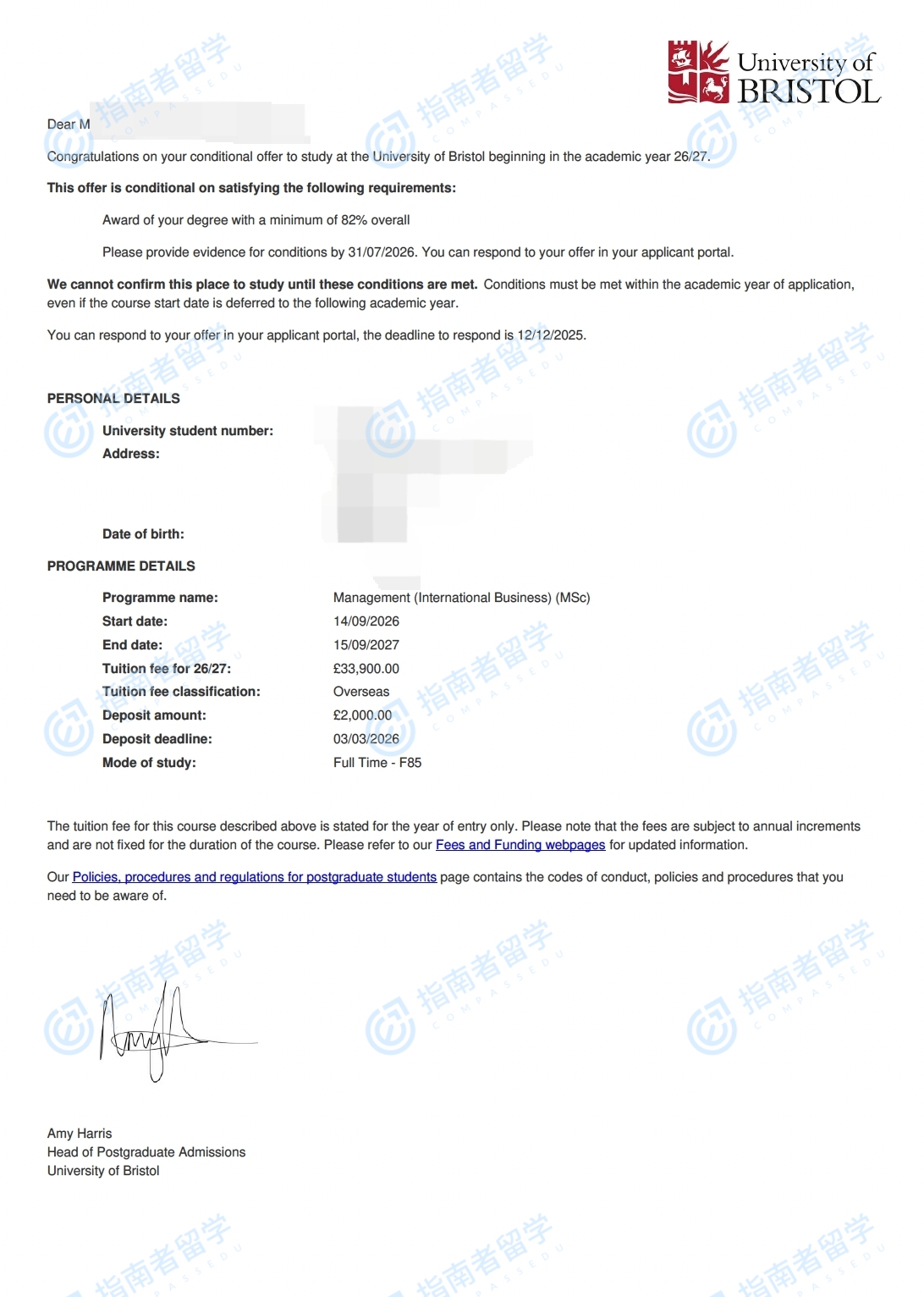 布里斯托大學(xué)管理學(xué)理學(xué)碩士(國際商務(wù))研究生offer一枚