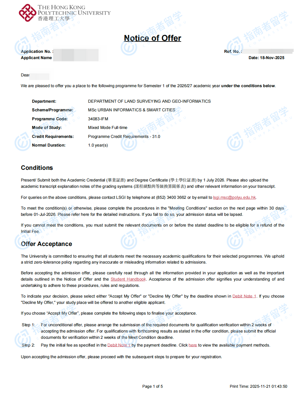 香港理工大學(xué)城市信息學(xué)及智慧城市理學(xué)碩士研究生offer一枚