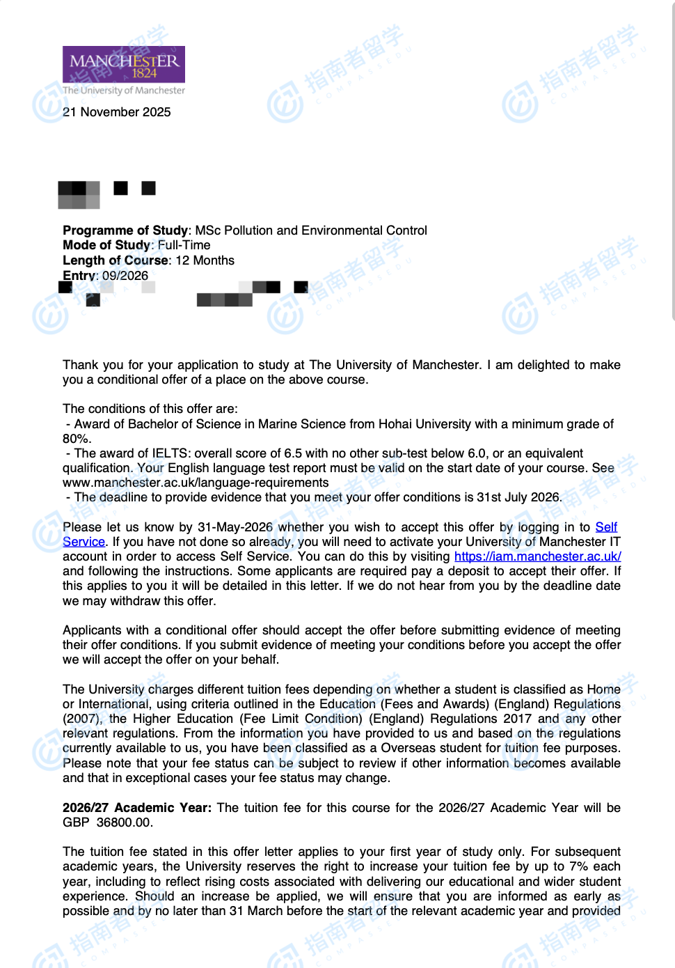 曼徹斯特大學污染與環(huán)境控制理學碩士研究生offer一枚