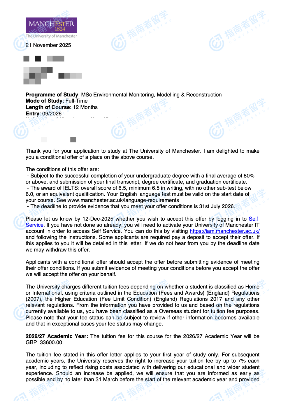 曼徹斯特大學(xué)環(huán)境監(jiān)測(cè)、建模與改造理學(xué)碩士研究生offer一枚