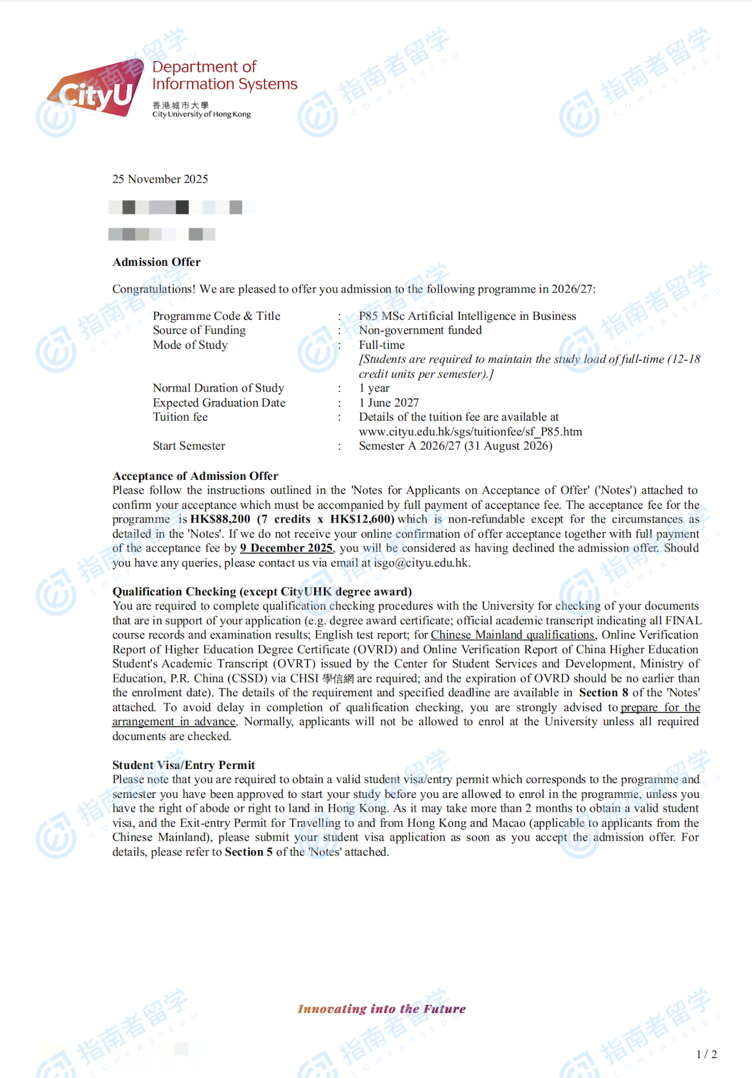 香港城市大學(xué)商業(yè)人工智能理學(xué)碩士研究生offer一枚
