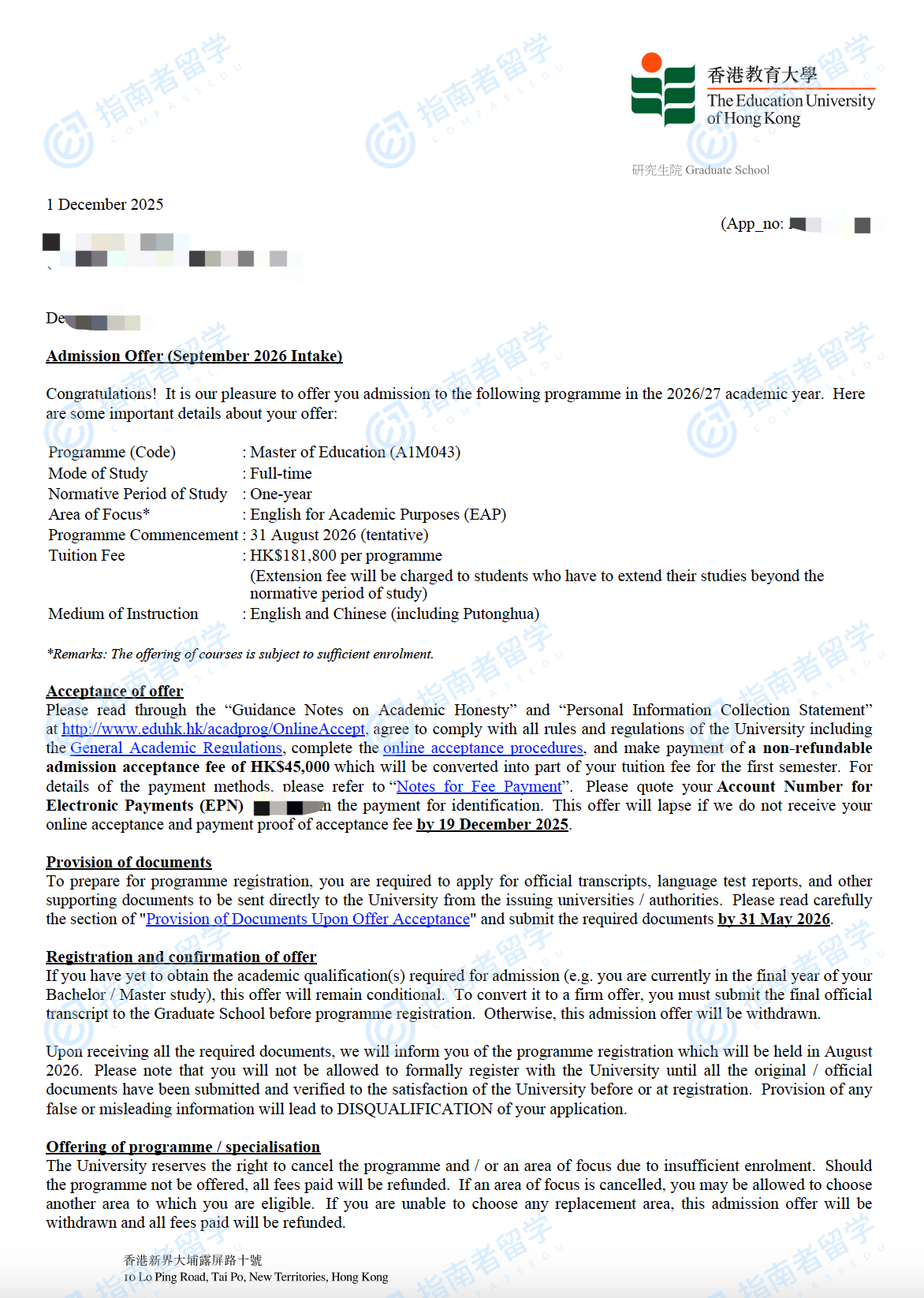 香港教育大學(xué)教育學(xué)碩士研究生offer一枚