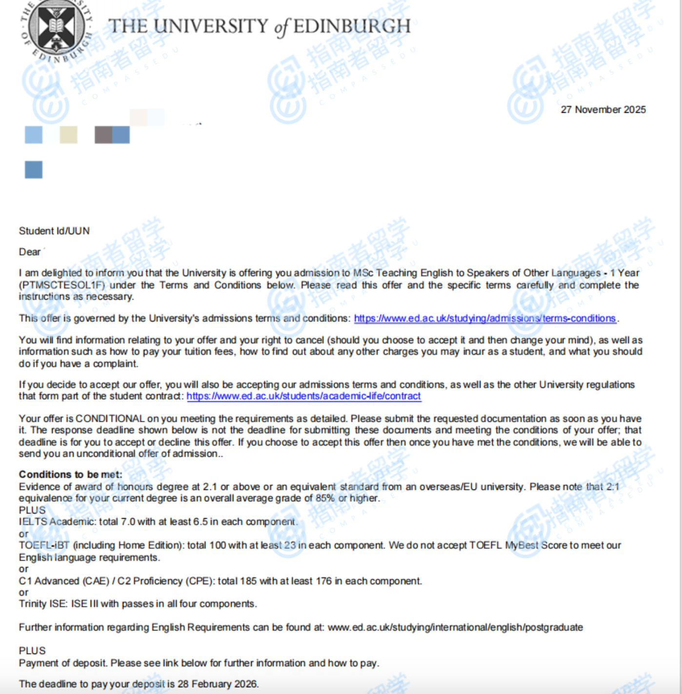 愛丁堡大學對外英語教學理學碩士研究生offer一枚