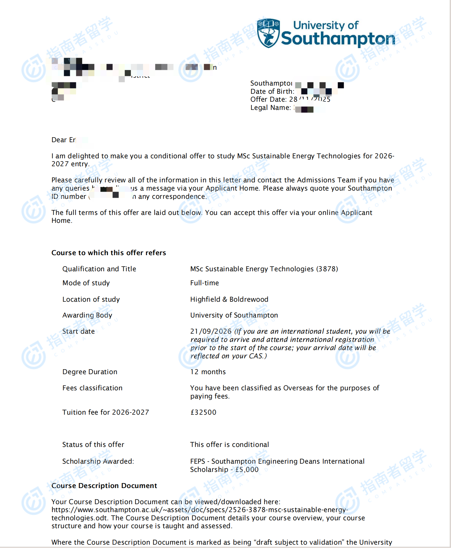 南安普頓大學(xué)可持續(xù)能源科技理學(xué)碩士研究生offer一枚
