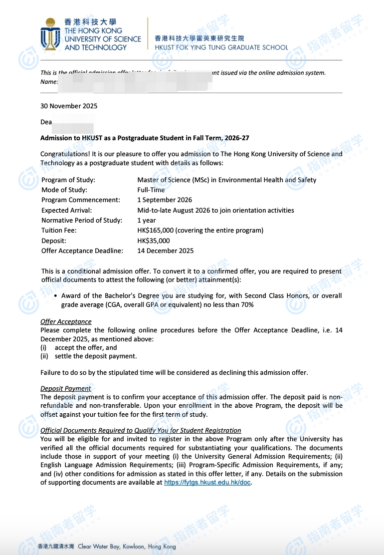 香港科技大學(xué)環(huán)境健康與安全理學(xué)碩士研究生offer一枚