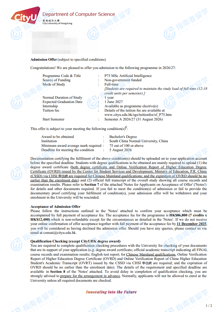 香港城市大學(xué)人工智能理學(xué)碩士研究生offer一枚