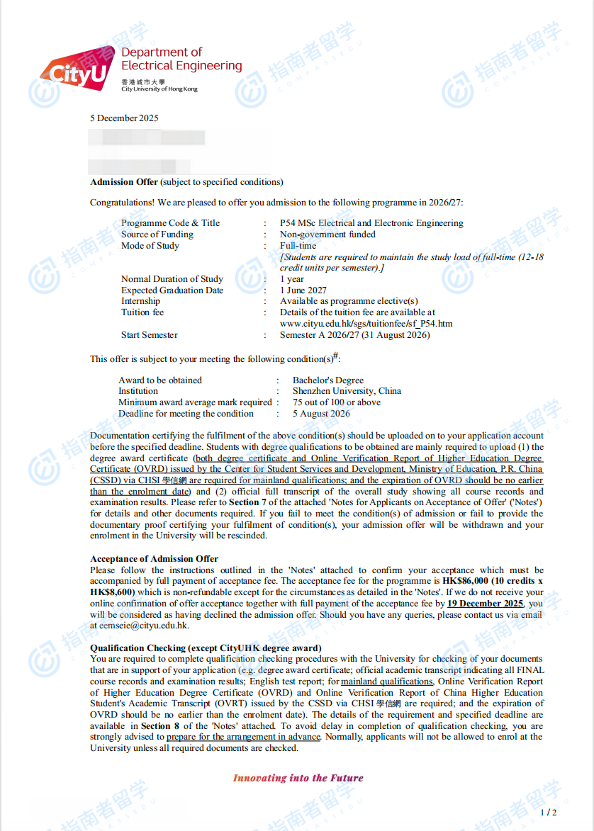 香港城市大學(xué)電機(jī)與電子工程學(xué)理學(xué)碩士研究生offer一枚