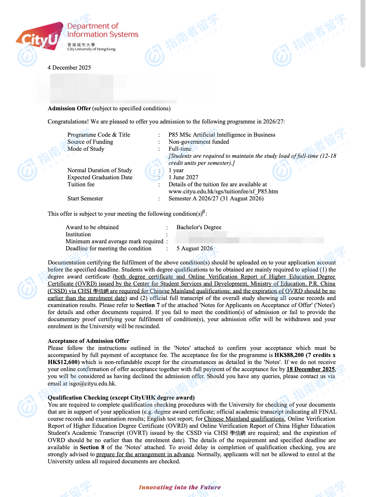香港城市大學(xué)商務(wù)資訊系統(tǒng)理學(xué)碩士(金融與智能科技)研究生offer一枚