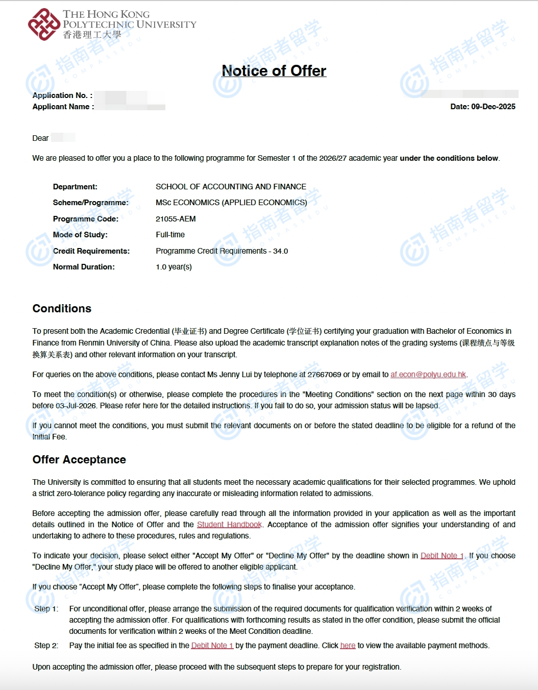香港理工大學(xué)經(jīng)濟(jì)學(xué)理學(xué)碩士(應(yīng)用經(jīng)濟(jì)學(xué))研究生offer一枚