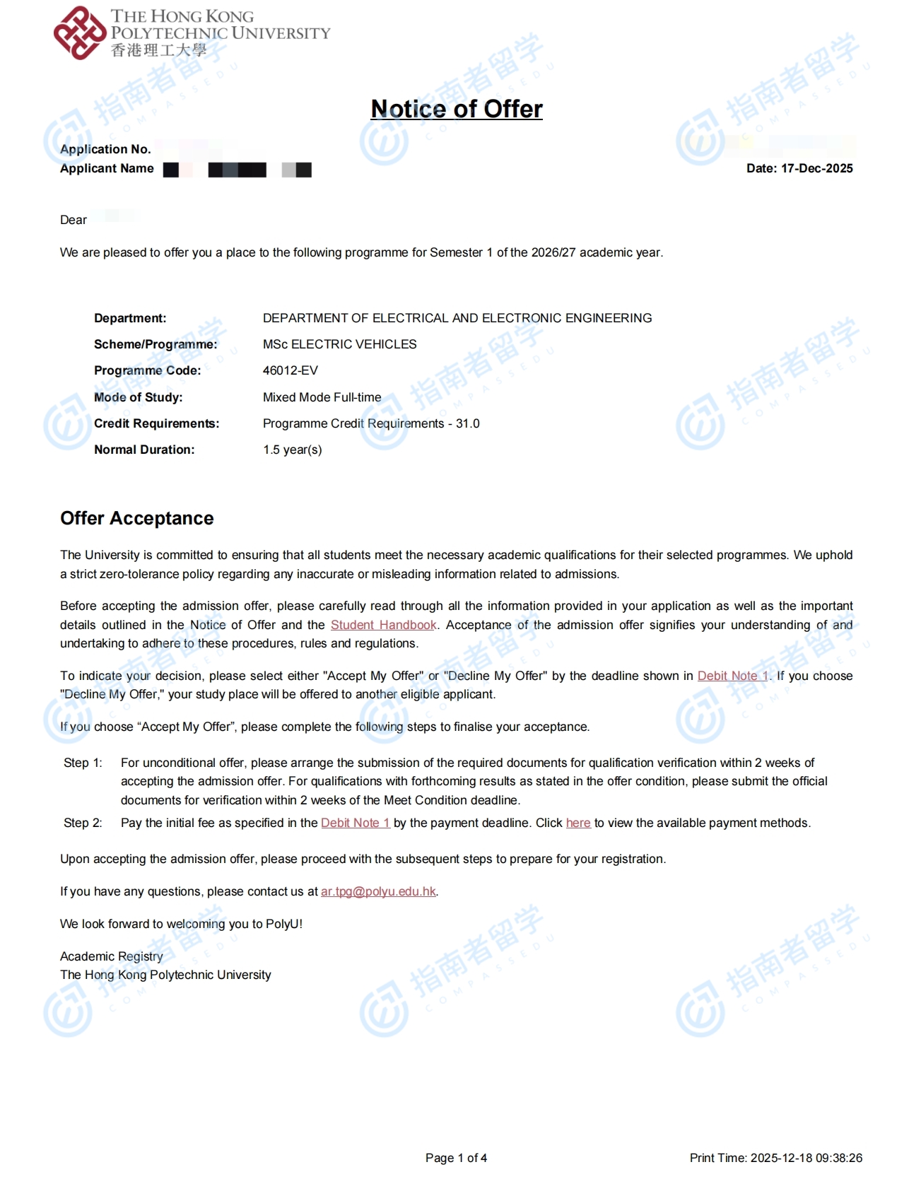 香港理工大學(xué)電動(dòng)汽車?yán)韺W(xué)碩士研究生offer一枚